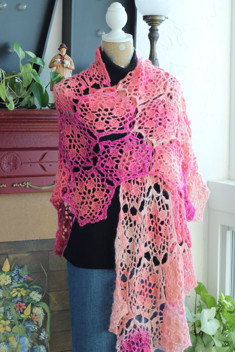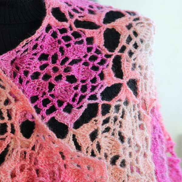 This Lace weight wrap made with flower motifs is the perfect way to welcome Spring. It’s light, easy to keep with you for those chilly breezes. Peony Wrap will be stunning worn for the holidays over that special dress.